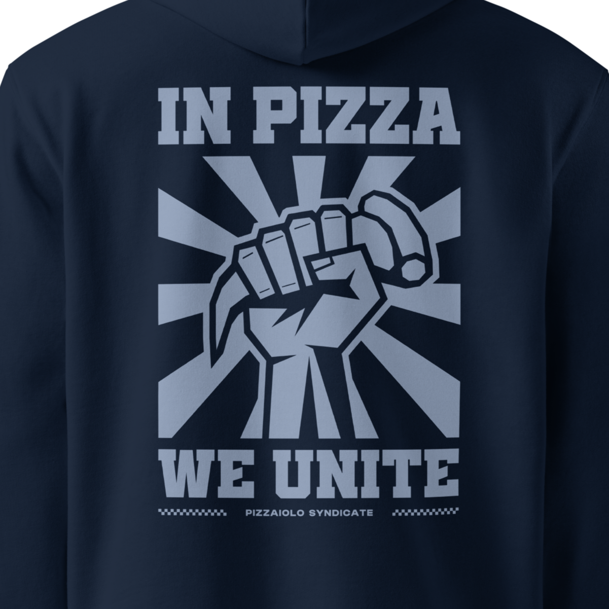 A raised fist, gripping a slice – framed by graphic rays and topped with the words “In Pizza We Unite.” It’s not just a design, it’s a declaration. This hoodie is for those who stand for crust, who believe in the process, and who know that good pizza – like good community – starts with fire, hands, and heart. Whether you’re prepping the dough or passing the peel, this piece says it for you.